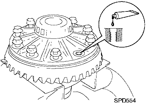 2. Apply locking sealant (Three Bond TB1324 Part No.999 -AM005P or equivalent) to ring gear bolts, and install them.