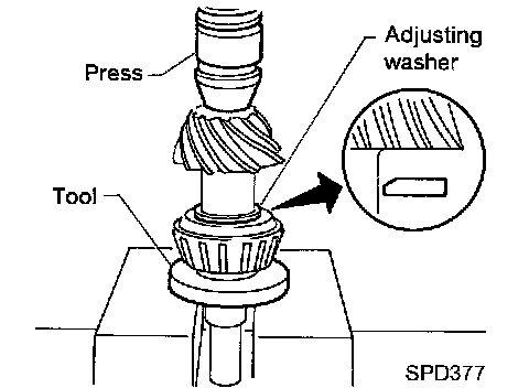 6. Install selected drive pinion height adjusting washer in drive pinion. Using press and Tool, press-fit pinion rear bearing inner cone into it.