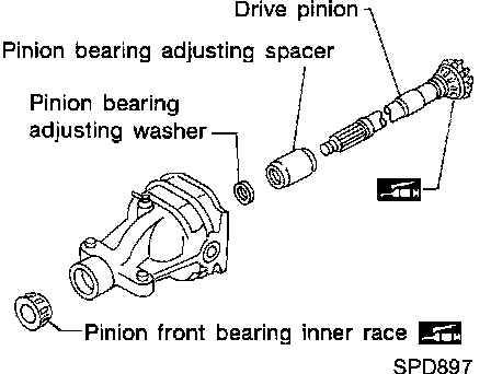 When pinion bearing preload is outside specifications, replacement is required for pinion bearing adjusting washer and spacer. Replace with those of different thickness.