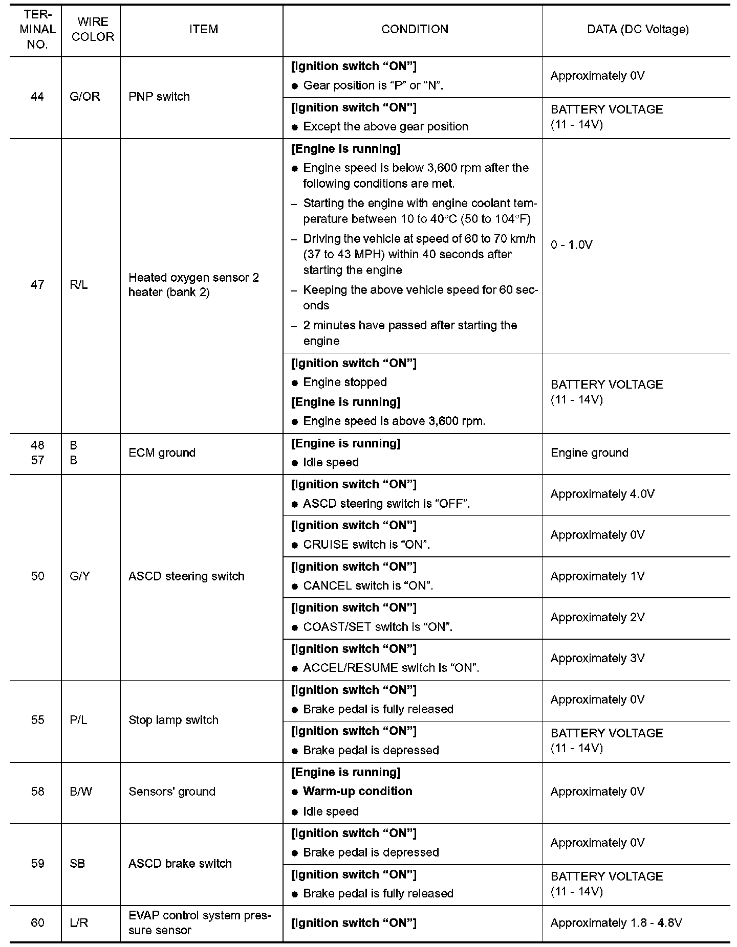 CAUTION: Do not use ECM ground terminals when measuring input/output voltage. Doing so may result in damage to the ECM's transistor. Use a ground other than ECM terminals, such as the ground.