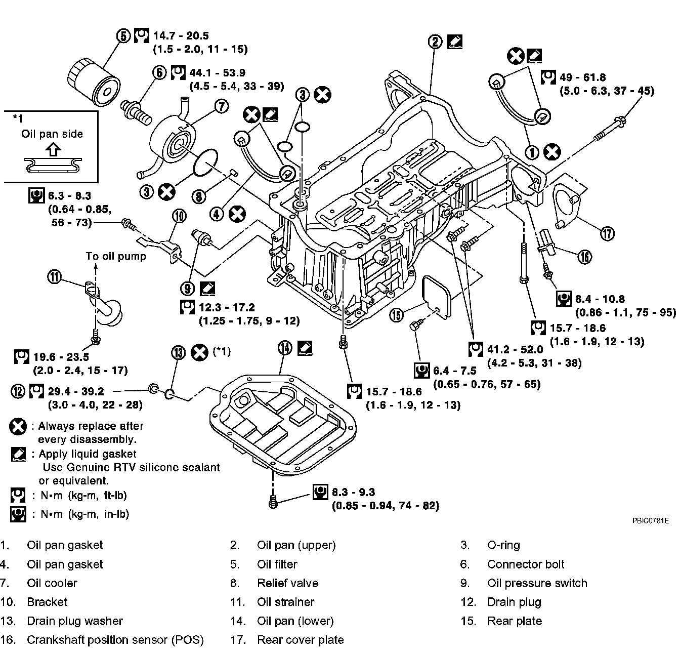 Oil pan (upper) 15.7 - 18.6 Nm (1.6- 1.9 kgf-cm, 12 - 13 ft. lbs.)
