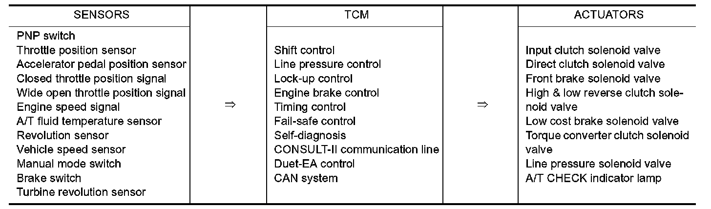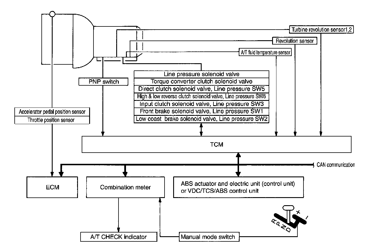 The automatic transmission senses vehicle operating conditions through various sensors or signals. It always controls the optimum shift position and reduces shifting and lock-up shocks.