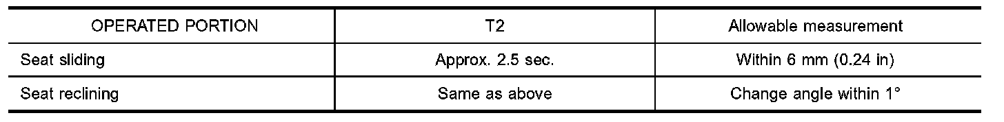 When the ignition switch is in the ON position, if any of the parts (indicated in the chart) move more than the specified amount within a period "T2" when no "ON" input is sent from any of the switches (indicated in the chart), or an output from the automatic drive positioner is not produced, an output failure is sensed.