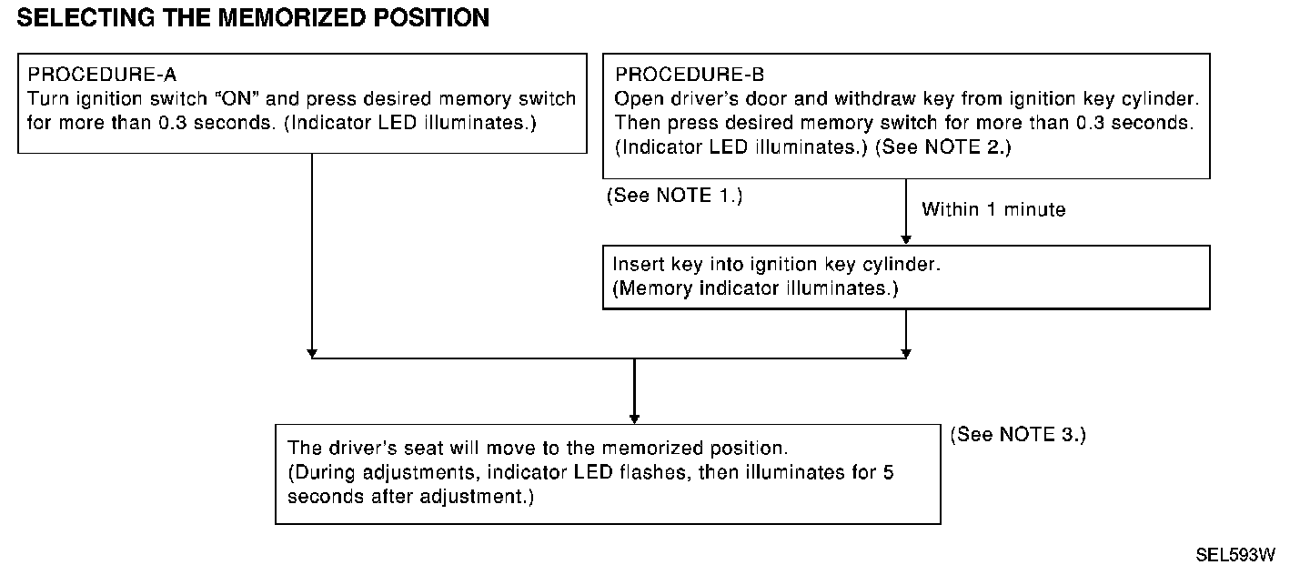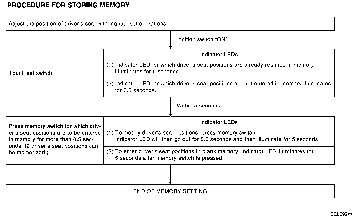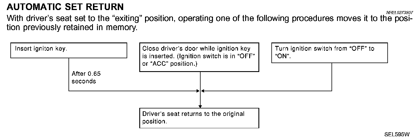 NOTE: When memory switch for which driver's seat positions are already retained in memory is pressed, new seat positions will be retained in memory in place of the previously set positions.