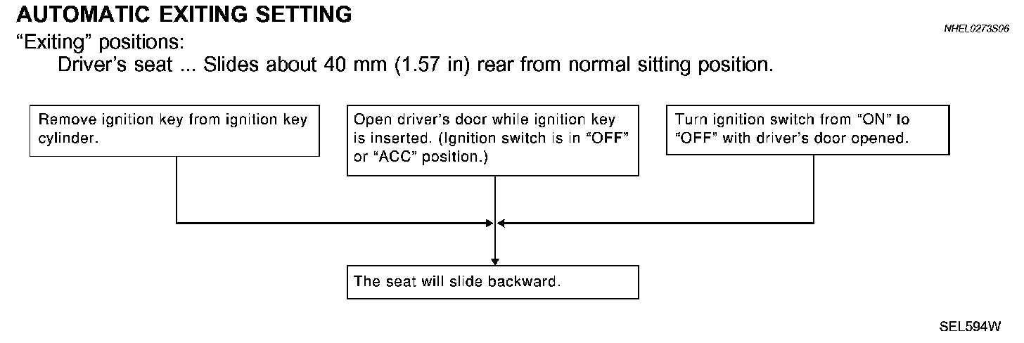 The driver's seat is adjusted to the proper positions for the driver automatically, in 3 different ways: MEMORY AUTOMATIC SET, AUTOMATIC EXITING SETTING and AUTOMATIC SET RETURN. (Automatic Drive Positioner = ADP)