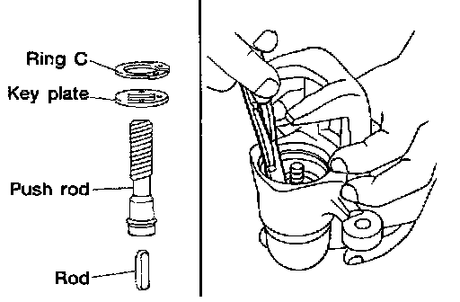 b. Pry off ring C, then remove key plate, push rod and rod.