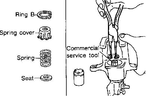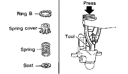 a. Pry off ring B with suitable pliers, then remove spring cover, spring and seat.