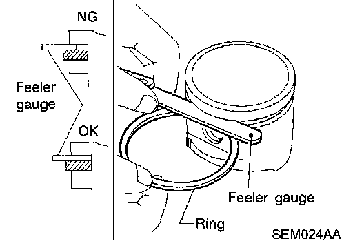 If out of specification, replace piston ring. If gap still exceeds the limit even with a new ring, do the following. Rebore cylinder and use oversized piston and piston rings.