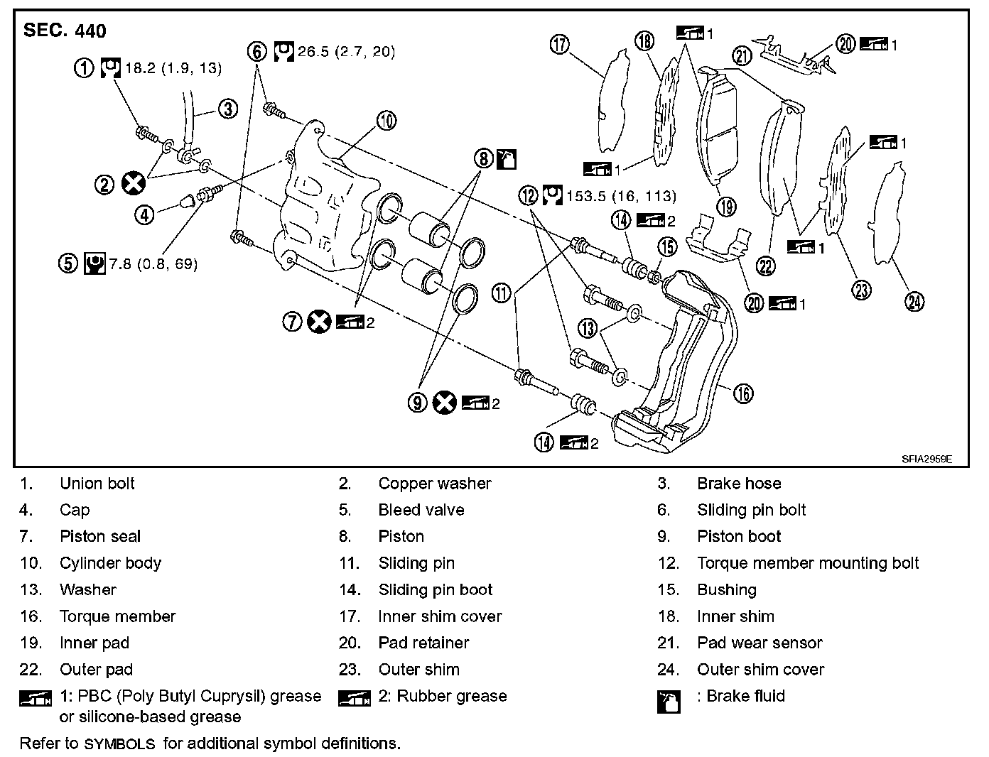 - THE LARGE ILLUSTRATIONS are exploded views (see the following) and contain tightening torques, lubrication points, section number of the PARTS CATALOG (e.g. SEC. 440) and other information necessary to perform repairs.