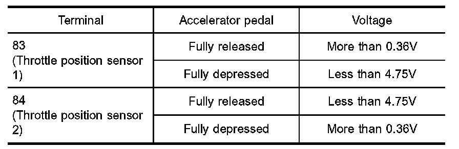 5. Check voltage between ECM terminals 83 (TP sensor 1), 84 (TP sensor 2) and engine ground under the following conditions.