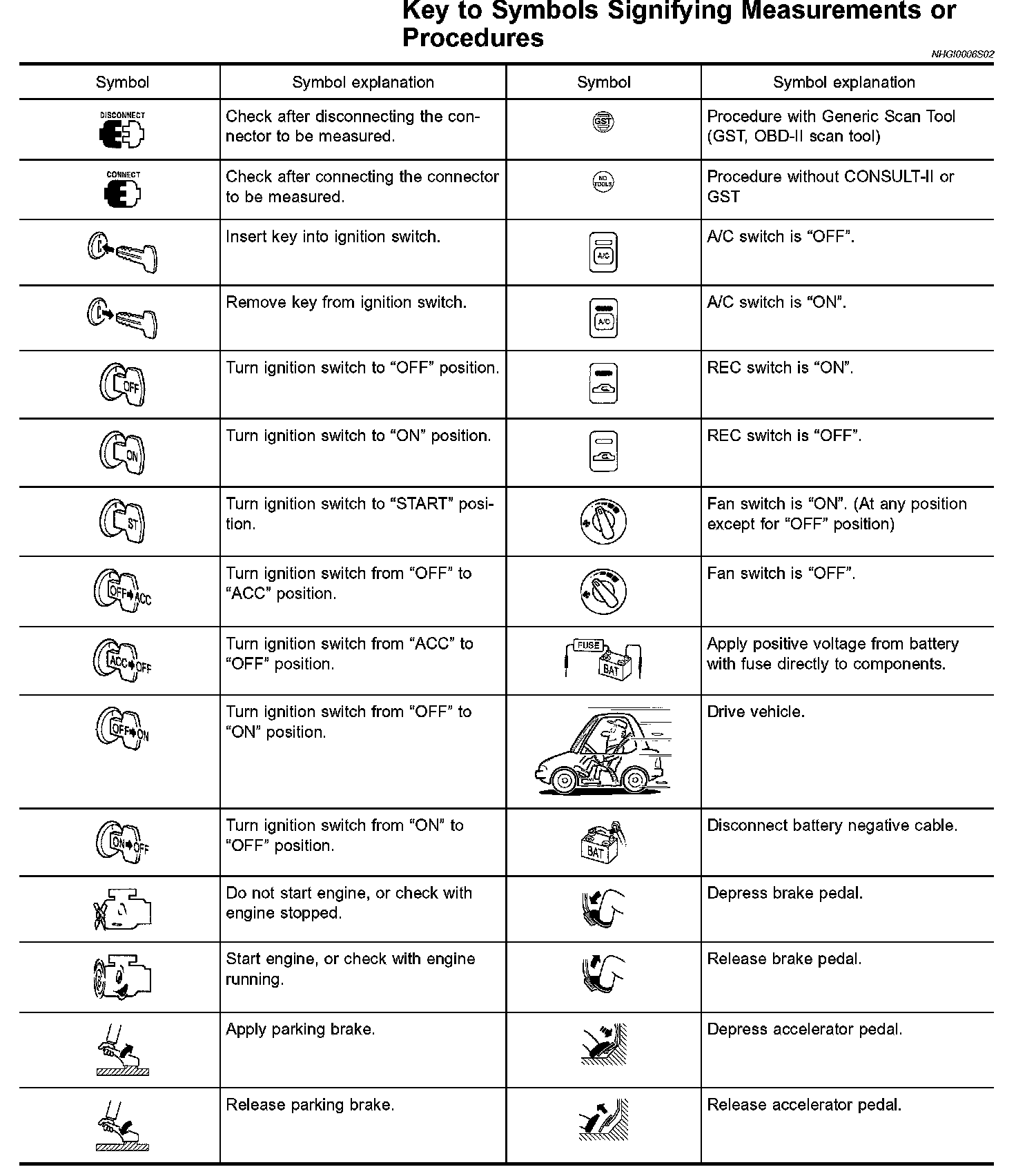 Symbols included in illustrations refer to measurements or procedures. Before diagnosing a problem familiarize yourself with each symbol. Refer to "CONNECTOR SYMBOLS" and "Key to Symbols Signifying Measurements or Procedures".