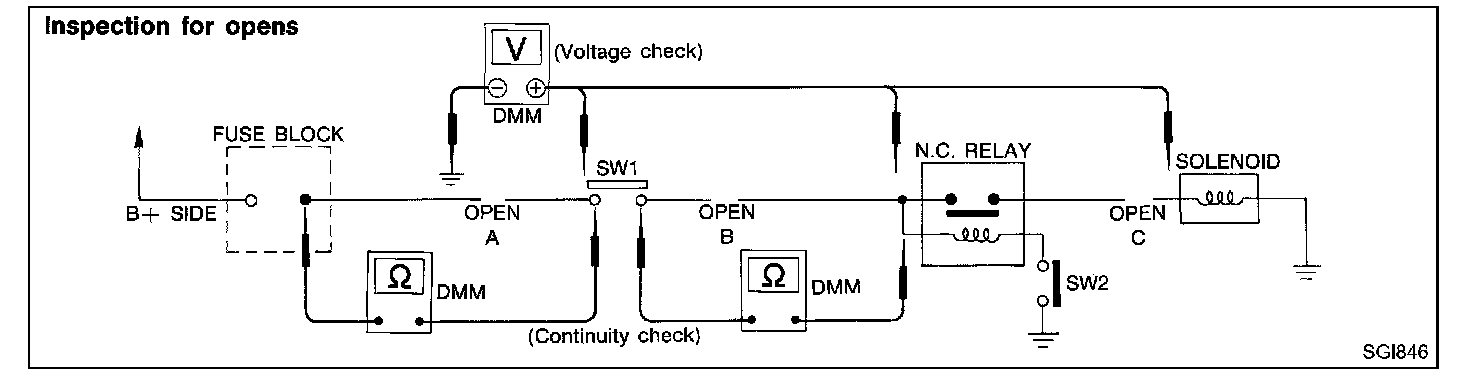 continuity; short is between SW1 and the relay (point B).