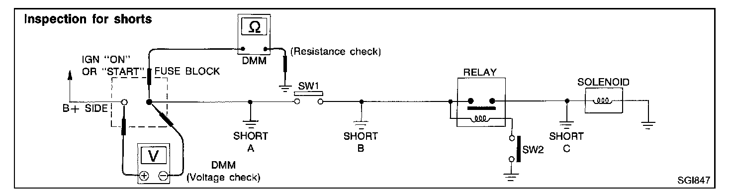 voltage; short is down the circuit of the relay or between the relay and the disconnected solenoid (point C).