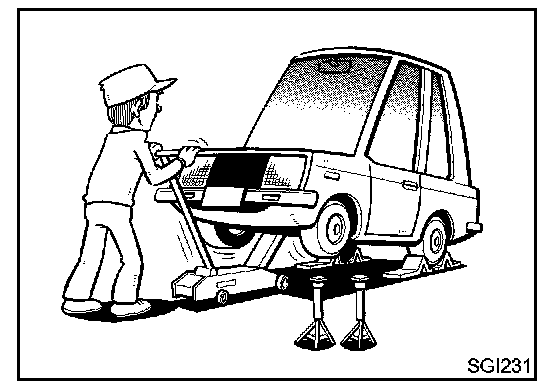 - Before jacking up the vehicle apply wheel chocks or other tire blocks to the wheels to prevent the vehicle from moving. After jacking up the vehicle support the vehicle weight with safety stands at the points designated for proper lifting before working on the vehicle.