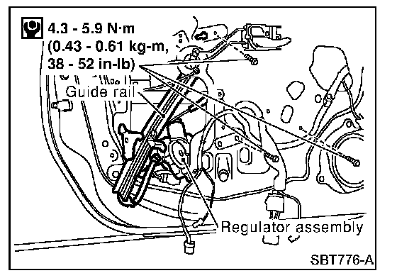 5. Remove bolts securing regulator assembly and guide rail, then remove regulator assembly and guide rail.