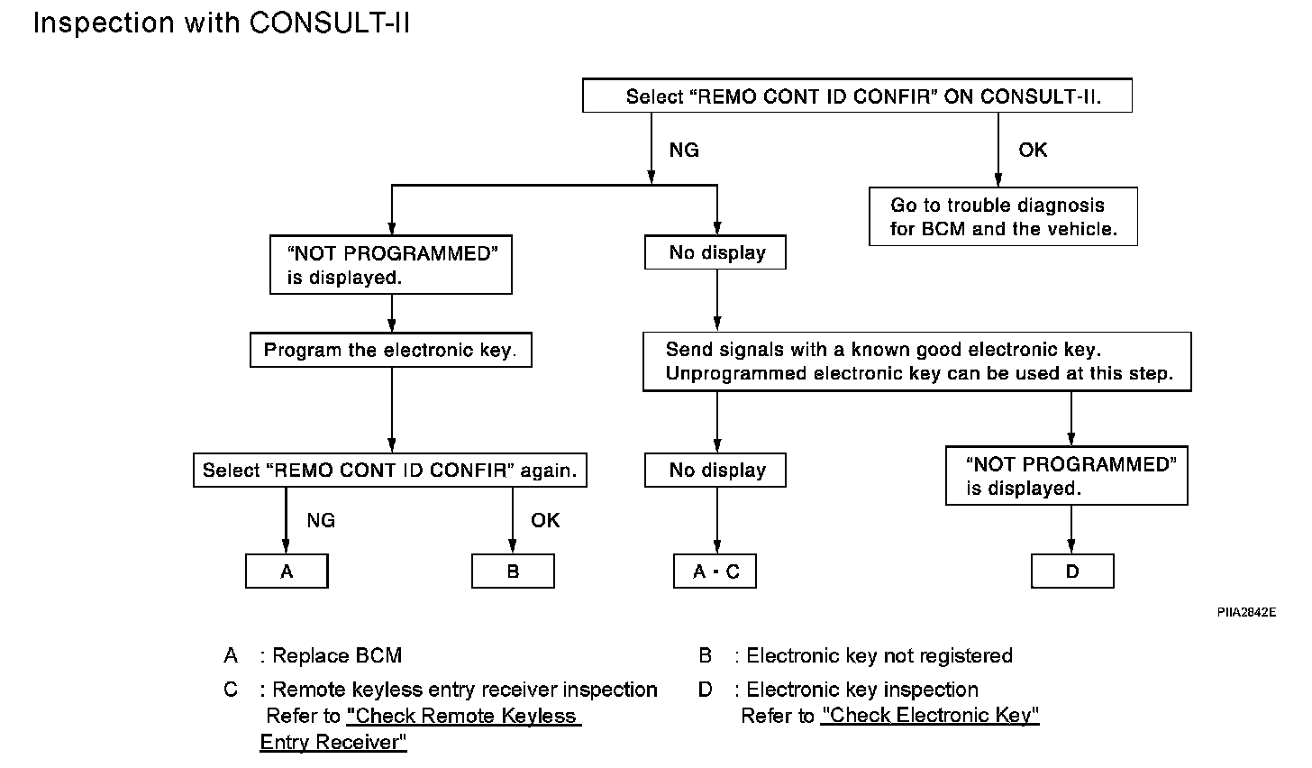 - Using the diagnosis flowchart, determine whether the electronic key or the vehicle component (remote keyless entry receiver or BCM) has a malfunction and confirm the part to be checked.