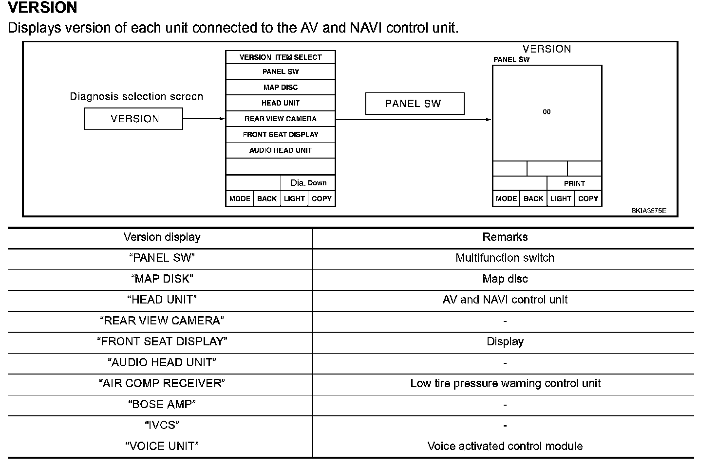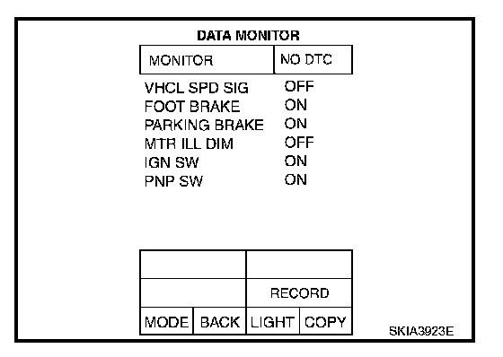 DATA MONITOR (SIGNAL MONITOR)- Displays status of the vehicle signal input to the AV and NAVI control unit. (Refer to "Confirmation/Adjustment Mode" for operation conditions for the connections to be indicated.)