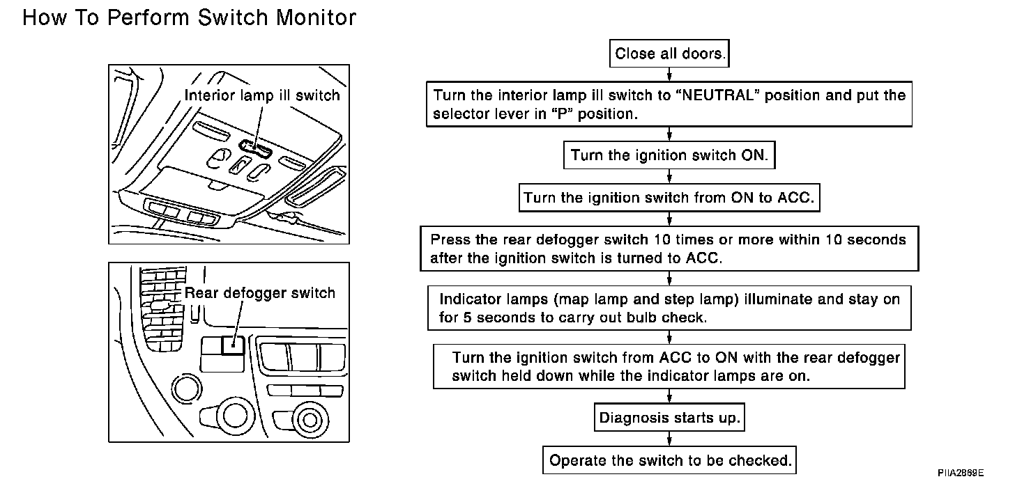 In this mode, when BCM detects the input signal from a switch in IVMS as shown, the detection is indicated by the map lamp and step lamps with buzzer.
