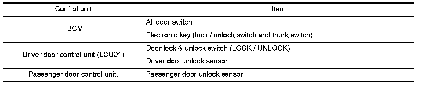 The status of the switch (except the ignition switch, interior lamp ill switch, and map lamp switch) as input to each control unit can be monitored.