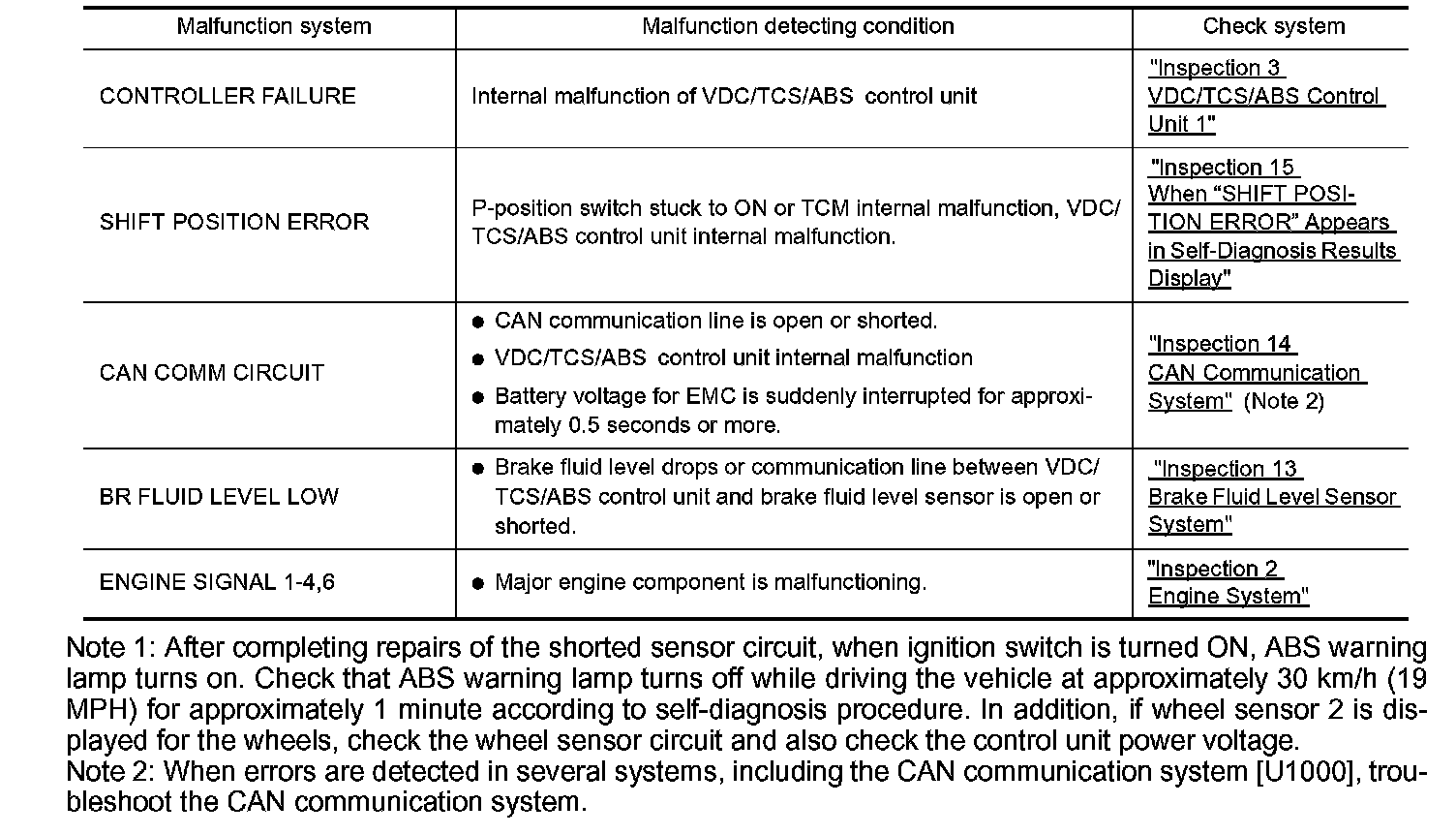 Note 1: After completing repairs of the shorted sensor circuit, when ignition switch is turned ON, ABS warning lamp turns on. Check that ABS warning lamp turns off while driving the vehicle at approximately 30 km/h (19 MPH) for approximately 1 minute according to self-diagnosis procedure. In addition, if wheel sensor 2 is displayed for the wheels, check the wheel sensor circuit and also check the control unit power voltage.