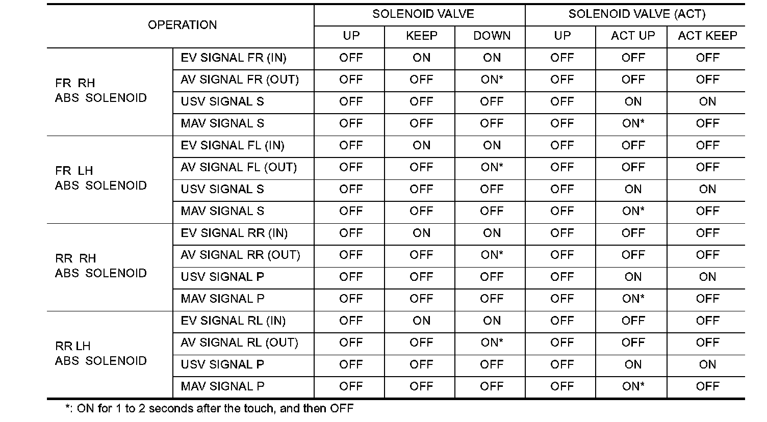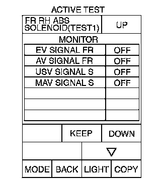 2. For ABS solenoid valve, touch "UP", "KEEP", and "DOWN". For ABS solenoid valve (ACT), touch "UP," "ACT UP," and "ACT KEEP". Use screen monitor to make sure solenoid valve operates as shown in Solenoid Valve Operation Chart above.