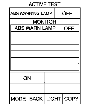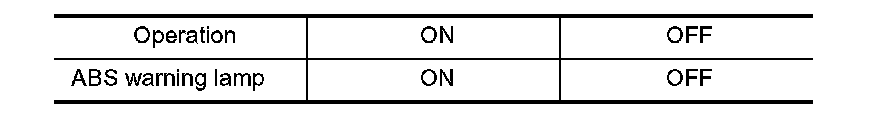 Touch "ON" and "OFF" on the screen. Make sure that ABS warning lamp operates as shown in table.