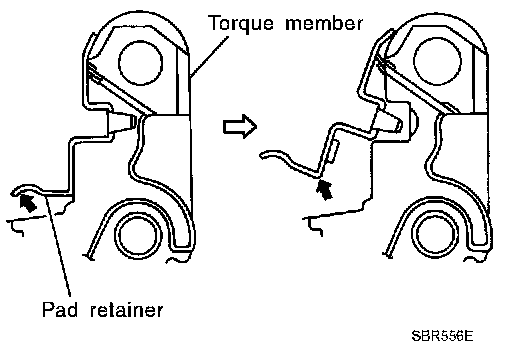 CAUTION: When removing the pad retainer from the torque member, lift the pad retainer in the direction shown by the arrow (shown in the figure) so as not to deform it.