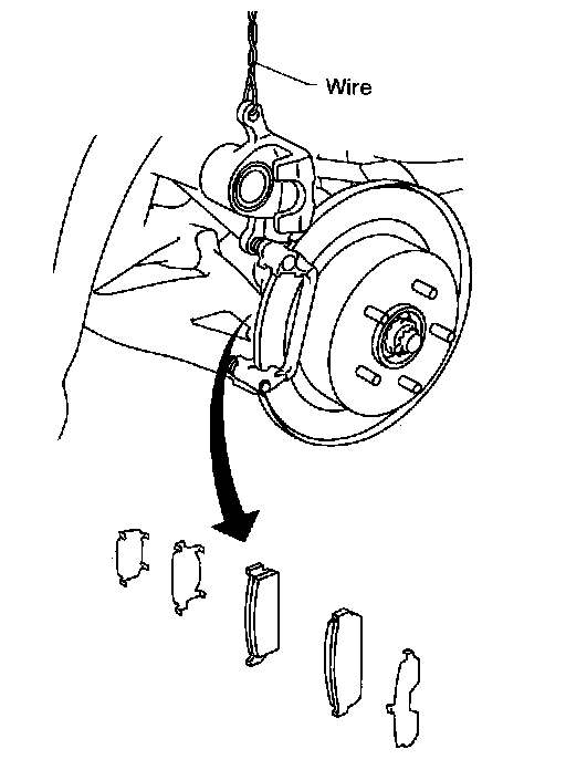 4. Hang the cylinder body with a wire, and remove the pads, pad retainers, shims and shim covers from the torque member.