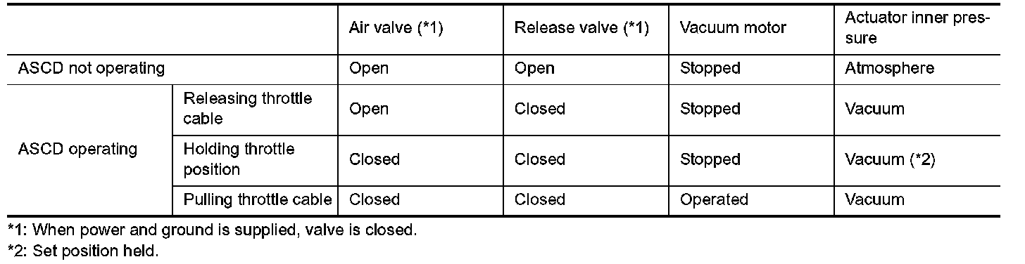 Ground is supplied to vacuum motor, air valve and release valve from ASCD control unit depending on the operated condition as shown in the table.