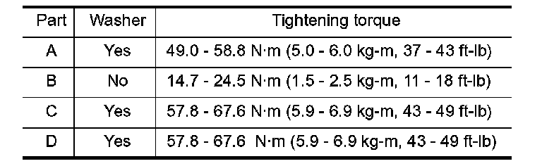 b. Tighten nuts to 13.7 to 15.7 Nm (1.4 to 1.6 kg-m, 10 to 12 ft. lbs.).