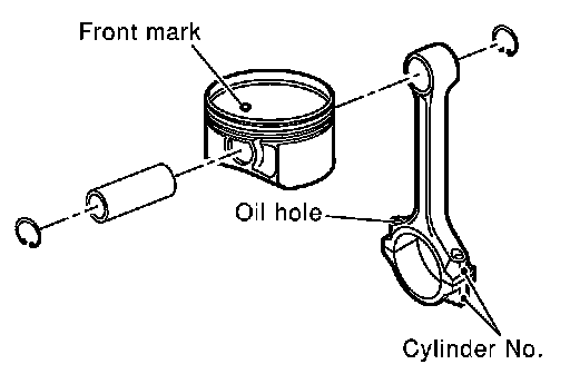 Assemble so that the front mark on the piston crown and the oil holes and the cylinder No. on the connecting rod are positioned as shown in the figure.