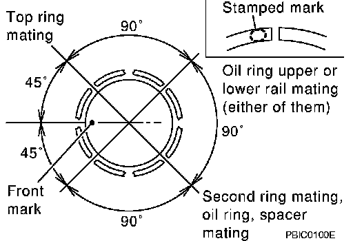 Position each ring with the gap as shown in the figure, referring to the piston front mark.