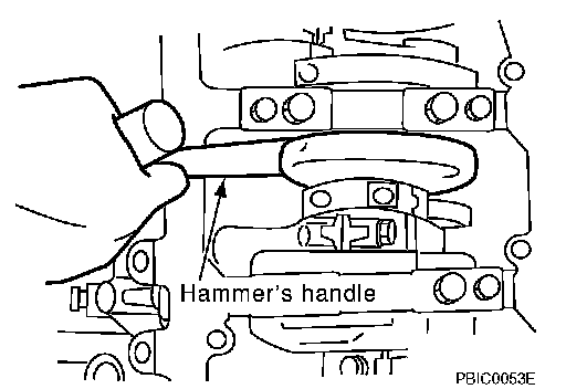 b. After confirming that the position of each part is in correct condition to allow for the spacer, force fit the spacer by lightly tapping with a plastic hammer until it contacts and does not go further.
