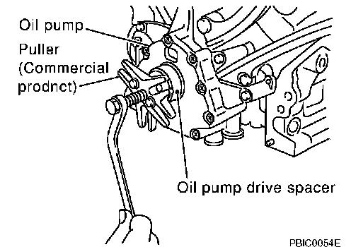 Install bolts into two bolt holes [M6 x pitch 1.0 mm (0.04 inch)] on front surface. Using a small puller, pull spacer off from crankshaft.