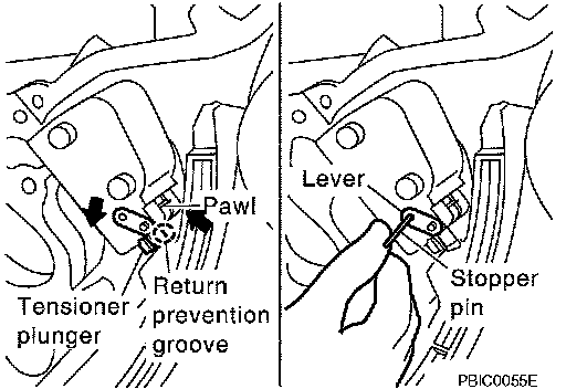 Lightly press tensioner plunger to release the tension of spring for this operation.