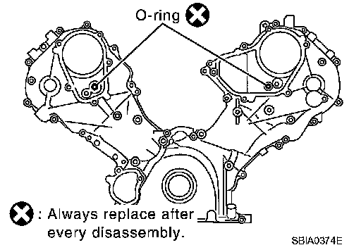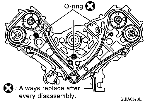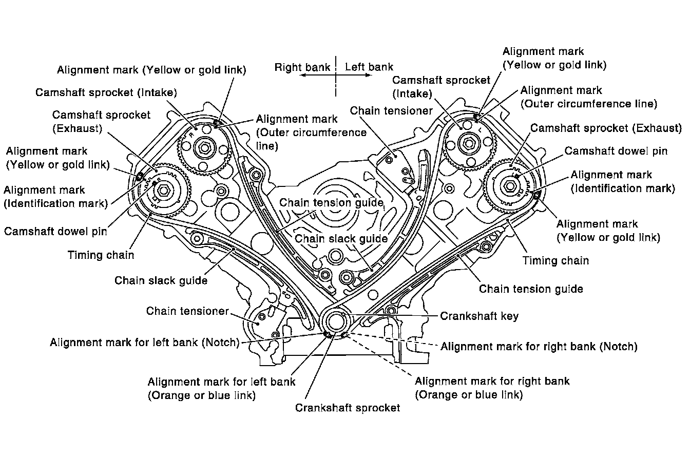 - To install timing chain and associated parts, start with those on right bank. The procedure for installing parts on left bank is omitted because it is the same as that for installation on right bank.