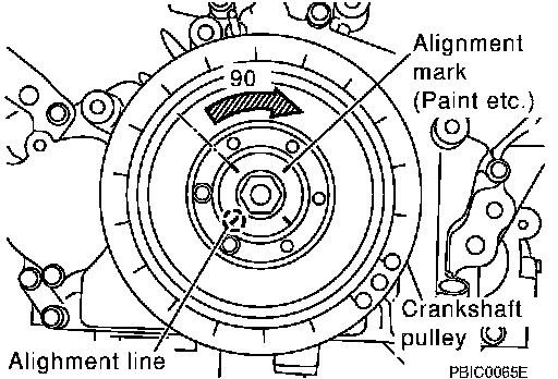 If the mating mark does not come in the position shown, turn crankshaft pulley once more to bring the mark in the position.
