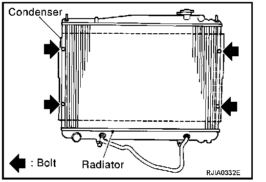 11. Remove radiator from the lower mount, move it to the engine side, then remove condenser between the radiator and the radiator core support.