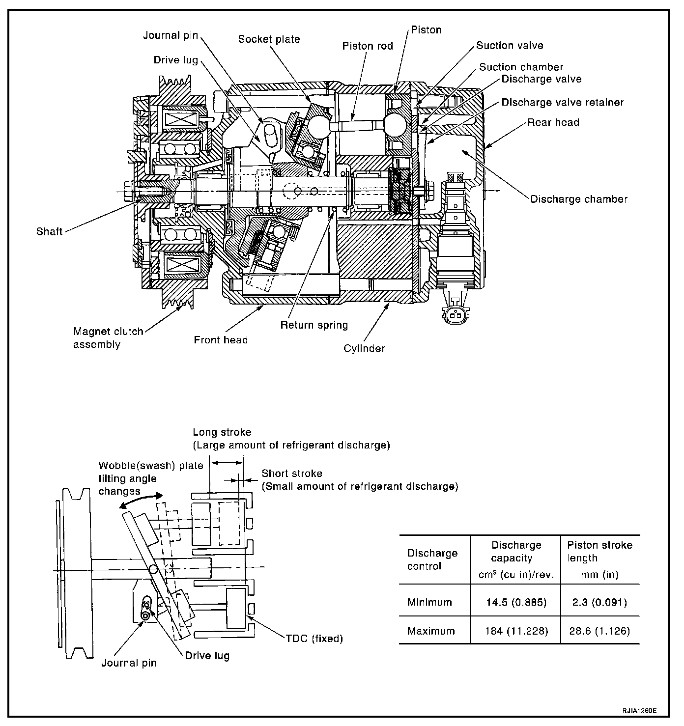 The tilt of the wobble (swash) plate allows the piston's stroke to change so that refrigerant discharge can be continuously changed from 14.5 to 184 cu.cm (0.885 to 11.228 cu in).