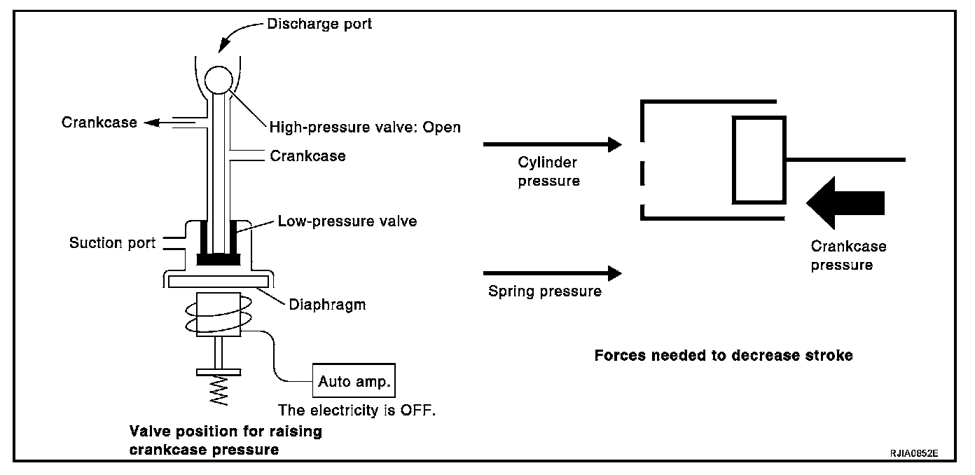 When no electric signal is sent from automatic amplifier (current: OFF), high-pressure valve is opened by spring force.