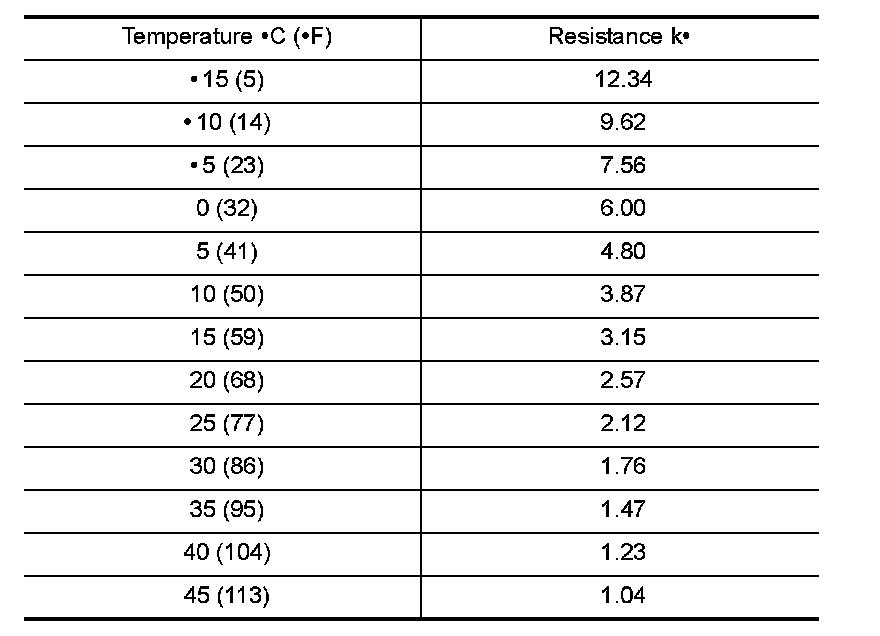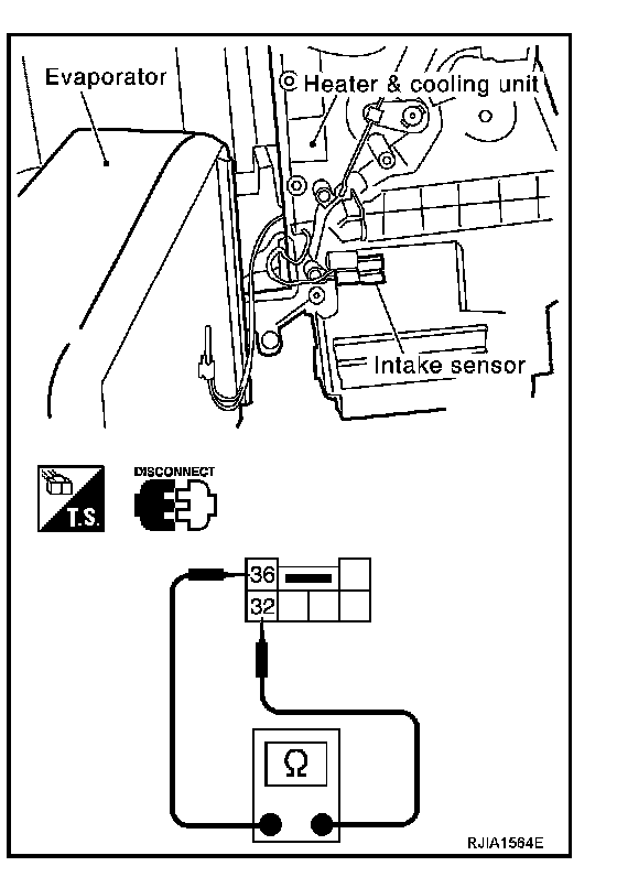After disconnecting intake sensor harness connector, measure resistance between terminals 32 and 36 at sensor harness side, using the table.