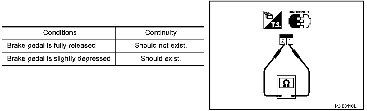2. Check continuity between stop lamp switch terminals 1 and 2 under the given conditions.