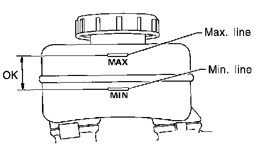 Checking Brake Fluid Level^ Check that the fluid level in the reservoir tank is within the standard (between MAX and MIN lines).