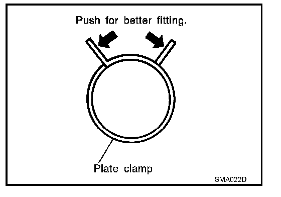 After installing plate clamps apply force to them in the direction of the arrow tightening rubber hose equally all around.