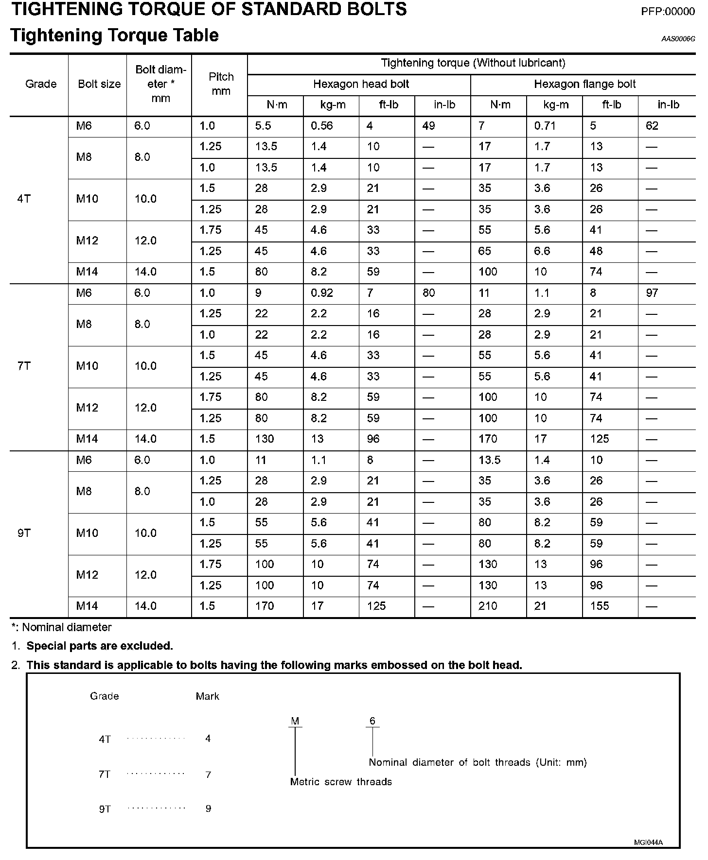 Tightening Torque Of Standard Bolts: