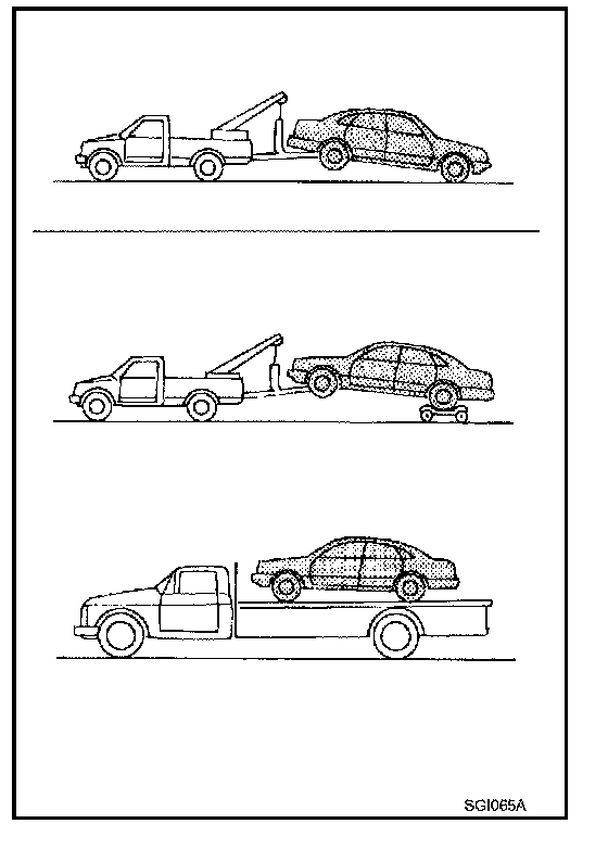 INFINITI recommends that the vehicle be towed with the driving (rear) wheels off the ground or place the vehicle on a flat bed truck as illustrated.