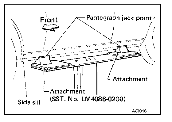 - The board-on lift attachment (LM4086-0200) set at front end of vehicle should be set on the front of the sill under the front door opening.