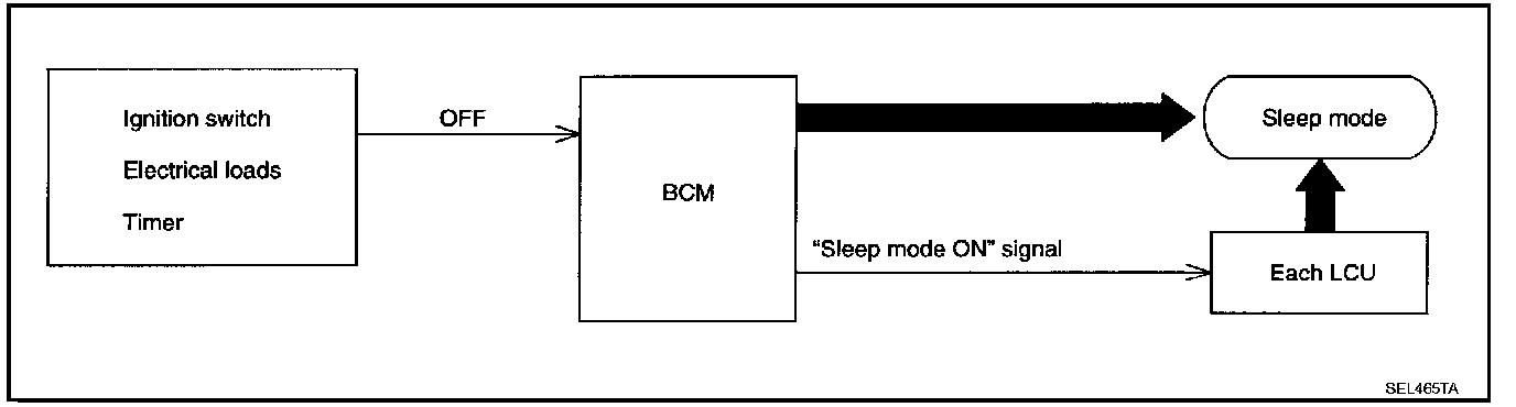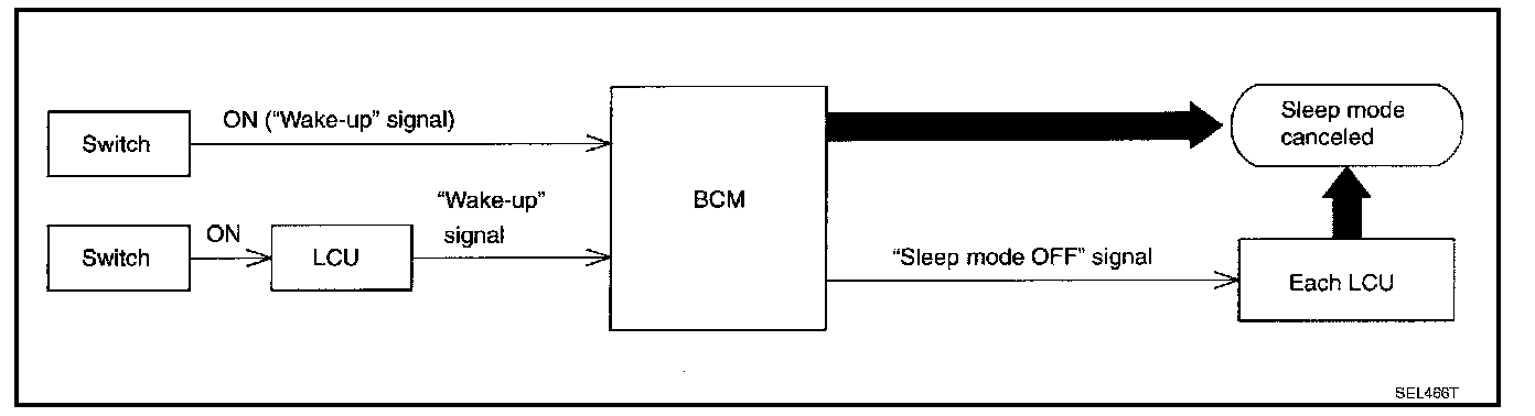 when the BCM detects a "wake-up" signal, it wakes up the whole system and starts communicating again. The "sleep" mode of all LCUs is now canceled, and the BCM returns to the normal control mode. When any one of the following switches are turned ON, the "sleep" mode is canceled:
