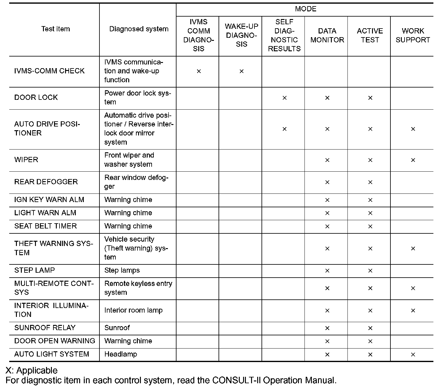 CONSULT-II FunctionCONSULT-II executes the following functions by combining data reception and command transmission via the communication line from BCM. IVMS communication inspection, work support (only function setting of seats and steering wheel), self-diagnosis, data monitor, and active test display.