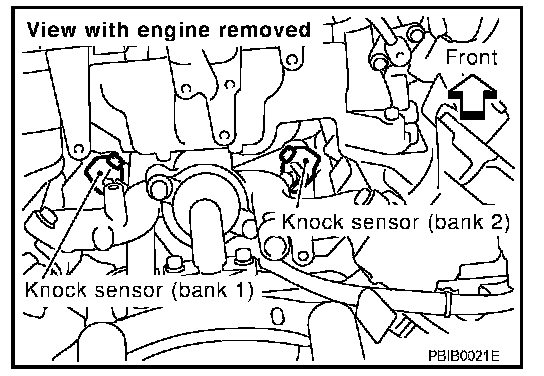 The knock sensor is attached to the cylinder block. It senses engine knocking using a piezoelectric element. A knocking vibration from the cylinder block is sensed as vibrational pressure. This pressure is converted into a voltage signal and sent to the ECM.